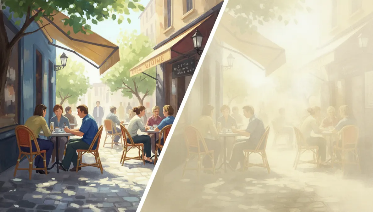 術前は水晶体の濁りが光を不規則に通すため、光が散乱し視界全体が白っぽく眩しく感じられます。